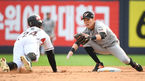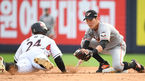 [OSEN=수원, 곽영래 기자] 9일 오후 경기도 수원 kt위즈파크에서 '2018 신한은행 MY CAR KBO리그’ kt 위즈와 한화 이글스의 경기가 열렸다.7회말 1사 2루 한화 강경학이 송은범의 2루 견제때 2루주자 kt 로하스를 아웃시키고 있다. / you