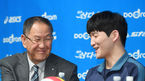 [OSEN=민경훈 기자] 11일 오후 서울 강남구 리베라호텔 베르사이유홀에서 진행된 2018∼2019 V-리그 남자부 미디어데이 행사에서 대한항공 박기원 감독이 정지석에게 물을 주며 미소짓고 있다./ rumi@osen.co.kr