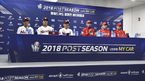 [OSEN=박준형 기자] 15일 오후 서울 고척스카이돔에서 2018 신한은행 MY CAR KBO 와일드카드 결정전 미디어데이가 개최됐다.이번 미디어데이에는 2018 KBO 정규시즌 4위 넥센 히어로즈 장정석 감독과 박병호, 이정후가 대표 선수로, 정규