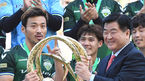 [OSEN=전주, 최규한 기자] 6번째 K리그 정상에 오른 전북 현대가 20일 오후 전주월드컵경기장에서 '2018 KEB 하나은행 K리그1' 우승 시상식을 진행했다.전북 이동국과 홍정호가 우승 트로피를 들고 기뻐하고 있다.지난 32라운드 울산