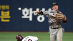 [OSEN=고척, 최규한 기자] 23일 오후 서울 고척 스카이돔에서 '2018 신한은행 MY CAR KBO리그 포스트시즌' 준플레이오프 4차전 넥센 히어로즈와 한화 이글스의 경기가 열렸다.7회말 1사 1루 상황 넥센 서건창의 병살타 때 한화 유격수 하