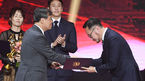 [OSEN=박준형 기자] 24일 오후 서울 방이동 올림픽공원 올림픽홀 광장에서 진행된 2018 대한민국 대중문화예술상 시상식에서 故 김주혁을 대신해 나무엑터스 김석준 이사가 국무총리 표창을 받고 있다./ /soul1014@osen.co.kr