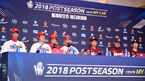 [OSEN=인천, 민경훈 기자] 26일 오후 인천 그랜드 오스티엄 CMCC홀에서 '2018 신한은행 MY CAR KBO' 플레이오프 미디어데이가 열렸다.SK 와이번스 힐만 감독과 박종훈, 한동민, 넥센 히어로즈에서는 장정석 감독과 한현희, 임병욱이 기자