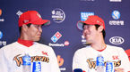 [OSEN=인천, 민경훈 기자] 26일 오후 인천 그랜드 오스티엄 CMCC홀에서 '2018 신한은행 MY CAR KBO' 플레이오프 미디어데이가 열렸다.무대 앞에서 SK 와이번스 힐만 감독과 박종훈, 한동민, 넥센 히어로즈에서는 장정석 감독과 한현희,