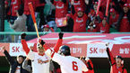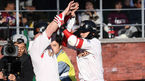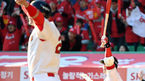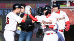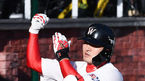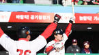 [OSEN=문학, 손용호 기자] 27일 인천 문학 SK 행복드림구장에서 SK 와이번스와 넥센 히어로즈의 '2018 신한은행 MY CAR KBO 플레이오프' 1차전 경기가 열렸다.5회말 2사 2,3루 김성현이 스리런 홈런을 치고 세리머리를 펼치고 있다./ spjj@os
