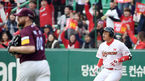 [OSEN=인천, 최규한 기자] 28일 인천 SK행복드림구장에서 '2018 신한은행 MY CAR KBO리그 포스트시즌' 플레이오프 2차전 SK 와이번스와 넥센 히어로즈의 경기가 열렸다.3회말 2사 3루 상황 SK 김강민이 동점 1타점 적시타를 치고 1루에 안