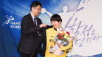 [OSEN=박준형 기자] 29일 오후 서울 청담 리베라호텔에서 2019 여자실업핸드볼 신인드래프트가 진행됐다.슈가글라이더즈 이민지가 2라운드 1순위로 지명된뒤 축하 꽃다발을 전달 받고 있다. /soul1014@osen.co.kr