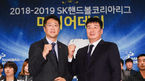 [OSEN=박준형 기자] 29일 오후 서울 청담 리베라호텔에서 2018-2019 SK핸드볼코리아리그 미디어데이가 진행됐다.개막전을 앞둔 두산 윤경신 감독과 SK호크스 황보성일 감독이 포즈를 취하고 있다. /soul1014@osen.co.kr