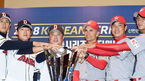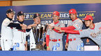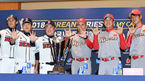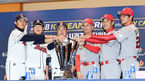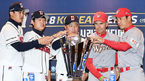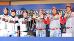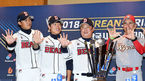 [OSEN=지형준 기자] 3일 오후 서울 삼성동 코엑스에서 2018 한국시리즈 미디어데이가 열렸다. 두산 이용찬, 정수빈, 김태형 감독과 SK 힐만 감독이 포토타임을 하고 있다. /jpnews@osen.co.kr