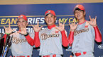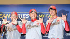 [OSEN=지형준 기자] 3일 오후 서울 삼성동 코엑스에서 2018 한국시리즈 미디어데이가 열렸다. SK 힐만 감독, 김강민, 김광현이 시리즈 경기수를 손가락으로 예측하고 있다. /jpnews@osen.co.kr
