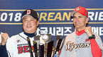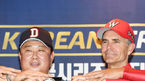 [OSEN=지형준 기자] 3일 오후 서울 삼성동 코엑스에서 2018 한국시리즈 미디어데이가 열렸다. 두산 김태형 감독과 SK 힐만 감독이 포토타임을 하고 있다. /jpnews@osen.co.kr