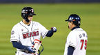 [OSEN=잠실, 이대선 기자] 5일 오후 서울 잠실야구장에서 '2018 신한은행 MY CAR KBO 포스트시즌' 한국시리즈 2차전 두산 베어스와 SK 와이번스의 경기가 열렸다.2회말 무사에서 두산 김재환이 우중간 2루타를 치고 김태균 코치의 축하