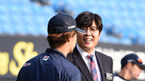 [OSEN=잠실, 이대선 기자] 5일 오후 서울 잠실야구장에서 열릴 '2018 신한은행 MY CAR KBO 포스트시즌' 한국시리즈 2차전 두산 베어스와 SK 와이번스의 경기에 앞서 정민철 해설위원이 두산 오재원과 이야기를 나누고 있다./sunday@osen.co.k