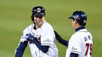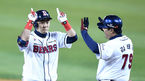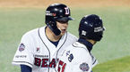 [OSEN=잠실, 이대선 기자] 5일 오후 서울 잠실야구장에서 '2018 신한은행 MY CAR KBO 포스트시즌' 한국시리즈 2차전 두산 베어스와 SK 와이번스의 경기가 열렸다.8회말 무사 1,3루에서 두산 양의지가 적시타를 치고 김태균 코치의 축하를