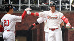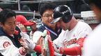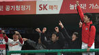 [OSEN=인천, 박재만 기자] '2018 신한은행 MY CAR KBO 포스트시즌' 한국시리즈 3차전 SK 와이번스와 두산 베어스의 경기가 7일 오후 인천 미추홀구 문학동 인천 SK행복드림구장에서 열렸다.8회말 선두타자 SK 로맥이 중월 홈런떄 더그아