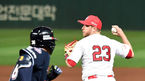 [OSEN=인천, 민경훈 기자] 7일 오후 인천 SK행복드림구장에서 열린 '2018 신한은행 MY CAR KBO 포스트시즌' 한국시리즈 3차전 SK 와이번스와 두산 베어스의 경기, 6회초 1사 주자 만루 두산 오재일의 투수 앞 땅볼때 SK 선발 켈리가 땅볼