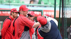 [OSEN=인천, 이대선 기자] 9일 오후 인천 SK행복드림구장에서 열릴 '2018 신한은행 MY CAR KBO 포스트시즌' 한국시리즈 4차전 SK 와이번스와 두산 베어스의 경기에 앞서 SK 최정이 동료들과 이야기를 나누고 있다./sunday@osen.co.kr