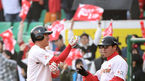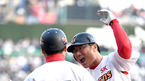[OSEN=지형준 기자] 10일 오후 인천 SK행복드림구장에서 '2018 신한은행 MYCAR KBO리그 포스트시즌' 한국시리즈 5차전 SK 와이번스와 두산 베어스의 경기가 열렸다. 8회말 1사2루에서 SK 최정이 박정권의 적시타에 홈을 밟고 이재원과 기