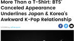 [OSEN=박소영 기자] 일본 TV아사히 측이 방탄소년단 지민이 과거 광복절 기념 티셔츠를 입은 걸 두고 돌연 방송 출연을 취소한 가운데 미국 유력 매체 빌보드가 이를 심도있게 다뤘다.10일(한국 시각) 빌보드는 "한국과 일본은