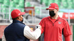 [OSEN=인천, 최규한 기자] 10일 오후 인천 SK행복드림구장에서 '2018 신한은행 MYCAR KBO리그 포스트시즌' 한국시리즈 5차전 SK 와이번스와 두산 베어스의 경기가 열린다.SK 힐만 감독과 박정권이 대화를 나누고 있다. /dreamer@osen.co.kr
