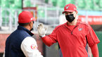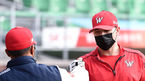 [OSEN=인천, 최규한 기자] 10일 오후 인천 SK행복드림구장에서 '2018 신한은행 MYCAR KBO리그 포스트시즌' 한국시리즈 5차전 SK 와이번스와 두산 베어스의 경기가 열린다.SK 정경배 코치와 로맥이 인사를 나누고 있다. /dreamer@osen.co.kr