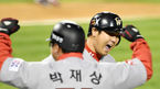 [OSEN=잠실, 이동해 기자] 12일 오후 서울 잠실구장에서 열린 '2018 신한은행 MYCAR KBO리그 포스트시즌' 한국시리즈 6차전 두산 베어스와 SK 와이번스의 경기, 9회초 2사 SK 최정이 동점 솔로홈런을 쏘아올린 후 더그아웃 앞에서 축하를