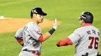 [OSEN=잠실, 민경훈 기자] 12일 오후 서울 잠실구장에서 열린 '2018 신한은행 MYCAR KBO리그 포스트시즌' 한국시리즈 6차전 두산 베어스와 SK 와이번스의 경기, 4회초 1사 주자 1루 SK 강승호가 좌월 투런 홈런을 날린 후 홈을 밟으며 정의