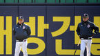 [OSEN=잠실, 민경훈 기자] 12일 오후 서울 잠실구장에서 열리는 '2018 신한은행 MYCAR KBO리그 포스트시즌' 한국시리즈 6차전 두산 베어스와 SK 와이번스의 경기에 앞서 두산 김태형 감독과 이강철 수석 코치가 외야에서 선수들의 훈련