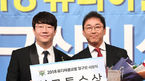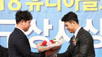 [OSEN=지형준 기자] 7일 오전 서울 청담동 리베라호텔에서 열린 2018 유디아글로벌 일구상시상식에서 한화 정우람이 최고투수상을 수상하고 있다. 시상자는 전년도 수상자 KIA 양현종. /jpnews@osen.co.kr