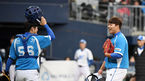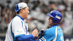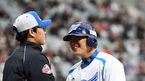 [OSEN=고척, 민경훈 기자] 9일 오후 서울 고척스카이돔에서 '양준혁재단 제7회 2018 희망더하기 자선야구대회'가 열렸다. 6회말 2사 주자 만루 종범신팀의 강백호가 신본기와 얘기를 나누고 있다./rumi@osen.co.kr