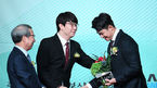 [OSEN=지형준 기자] 두산 김재환이 11일 오전 서울 광화문 포시즌스호텔에서 열린 '2018 동아스포츠대상'에 참석해 프로야구 올해의 선수상을 수상하며 KIA 양현종의 축하를 받고 있다. /jpnews@osen.co.kr