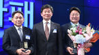 [OSEN=최규한 기자] 18일 오후 서울 종로구 JW메리어트 동대문 스퀘어 서울에서 '2018 KFA 어워즈' 시상식이 열렸다.공로패를 수상한 한국찬 경기 FA 사무차장과 김희철 충북FA 사무차장이 대한축구협회 이석재 이사와 기념촬영을 하