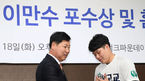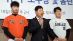 [OSEN=이동해 기자] 18일 오후 서울 도곡동 KBO 야구회관 7층 브리핑룸에서 '제2회 이만수 포수상 및 홈런상 시상식'이 열렸다.이만수 전 감독이 홈런상-포수상을 수상한 북일고 변우혁-신일고 김도환을 바라보고 있다. / eastsea@osen.c