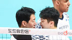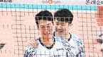 [OSEN=안산,박준형 기자] 28일 오후 경기도 안산시 상록수체육관에서 진행된 2018~2019 도드람 프로배구 V리그 OK저축은행과 우리카드의 경기, 1세트 윤봉우와 나경복이 미소 짓고 있다. / soul1014@osen.co.kr