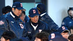 [OSEN=지형준 기자] 두산 베어스 시무식 겸 창단 기념일 행사가 15일 오전 서울 잠실야구장에서 열렸다.김태형 감독이 입장하며 배영수와 인사를 나누고 있다. /jpnews@osen.co.kr