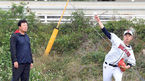[OSEN=오키나와, 손용호 기자] 13일 오키나와 구시가와구장에서 두산 베어스가 구슬땀을 흘리며 훈련에 매진했다.두산 캠프를 방문한 선동렬 전 감독이 이영하에 스텝 슬로우 투구를 전수하고 있다./spjj@osen.co.kr