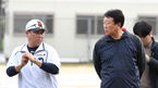 [OSEN=오키나와, 손용호 기자] 13일 오키나와 구시가와구장에서 두산 베어스가 구슬땀을 흘리며 훈련에 매진했다.두산 캠프를 방문한 선동렬 전 감독이 김태형 코치와 이야기를 나누고있다./spjj@osen.co.kr