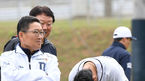 [OSEN=오키나와, 손용호 기자] 13일 오키나와 구시가와구장에서 두산 베어스가 구슬땀을 흘리며 훈련에 매진했다.두산 캠프를 방문한 선동렬 전 감독이 불펜 피칭을 마친 이동원에게 박수를 쳐주고있다./spjj@osen.co.kr