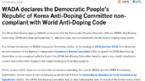 [OSEN=강필주 기자] 남북 체육 회담을 하루 앞두고세계 반도핑기구(WADA)가 북한을 '반도핑 비준수 국가'로 지정했다.WADA는 14일(한국시간) 북한의 도핑방지위원회를 반도핑 비준수 단체로 지정,이를 발표했다. WADA는 지난해 9월 20