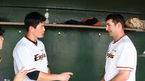 [OSEN=오키나와, 손용호 기자] 13일 오키나와 고친다 구장에서 한화 이글스와 삼성 라이온즈의 연습경기가 벌어졌다.경기 전 김태균과 김동엽이 수다를 떨고 있다./spjj@osen.co.kr