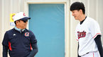 [OSEN=오키나와, 손용호 기자] 13일 오키나와 고친다구장에서 한화 이글스 선수들이 구슬땀을 흘리며 훈련에 매진했다.한화 서폴드의 불펜 피칭 후 한용덕 감독과 송진우 코치가 투구폼에 대해 이야기를 나누고 있다./spjj@osen.co.kr
