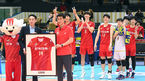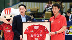 [OSEN=박준형 기자] 16일 수원실내체육관에서 진행된 도드람 2018~2019시즌 V리그 남자부 한국전력과 우리카드의 경기, 2세트 종료 후 한국전력 권영민 코치가 은퇴식을 갖고 포즈를 취하고 있다. / soul1014@osen.co.kr