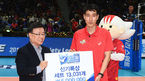 [OSEN=박준형 기자] 16일 수원실내체육관에서 진행된 도드람 2018~2019시즌 V리그 남자부 한국전력과 우리카드의 경기, 2세트 종료 후 한국전력 권영민 코치가 신기록상을 수상한뒤 포즈를 취하고 있다.권영민 코치는 현역 시절 1만3