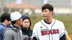 [OSEN=오키나와, 손용호 기자] 17일 오키나와 구시가와 구장에서 두산 베어스가 오키나와에서의 마지막 훈련을 가졌다.권혁이 이적 후 첫 불펜 피칭을 마치고 김원형 코치와 이야기를 나누고있다./spjj@osen.co.kr
