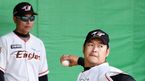 [OSEN=오키나와(일본), 민경훈 기자] 2일 일본 오키나와 고친다 구장에서 한화 이글스와 롯데 자이언츠의 연습경기가 열릴 예정인 가운데 한화 한용덕 감독이 불펜에서 타자 포즈를 취하며 투수들의 불펜피칭을 돕고 있다./rumi@osen