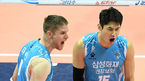 [OSEN=안산, 최규한 기자] 5일 오후 경기도 안산 상록수체육관에서 ‘도드람 2018-2019 V리그’ OK저축은행과 삼성화재의 경기가 열렸다.1세트, 삼성화재 타이스와 지태환이 득점에 환호하고 있다. /dreamer@osen.co.kr