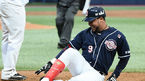 [OSEN=박준형 기자] 10일 오후 서울 고척스카이돔에서 열린 키움 히어로즈와 두산 베어스의 연습경기, 3회초 두산 선두타자 페르난데스가 안타를 치고 귀루하는 과정에서 넘어진뒤 미소 짓고 있다/ soul1014@osen.co.kr