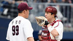 [OSEN=고척, 이동해 기자] 16일 오후 서울 고척스카이돔에서 열린 ’2019 KBO리그 시범경기' 키움 히어로즈와 롯데 자이언츠의 경기, 6회초 1사 만루 상황 키움 윤정현-박동원 배터리가 마운드에서 이야기 나누고 있다. / eastsea@osen.