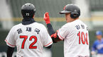 [OSEN=부산,박준형 기자]20일 오후 부산 사직구장에서 열린 KBO리그 시범경기 롯데 자이언츠와 삼성 라이온즈의 경기, 6회말 2사 2루 롯데 김민수가 1타점 적시타를 날린뒤 윤재국 코치와 하이파이브를 하고 있다. / soul1014@osen.co.kr