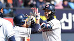 [OSEN=잠실, 최규한 기자] 23일 서울 잠실야구장에서 '2019 신한은행 MY CAR KBO리그 개막전' 두산 베어스와 한화 이글스의 경기가 열렸다.4회말 무사 1루 상황 두산 박건우가 역전 좌중간 투런포를 날리고 홈을 밟으며 정수빈과 기뻐